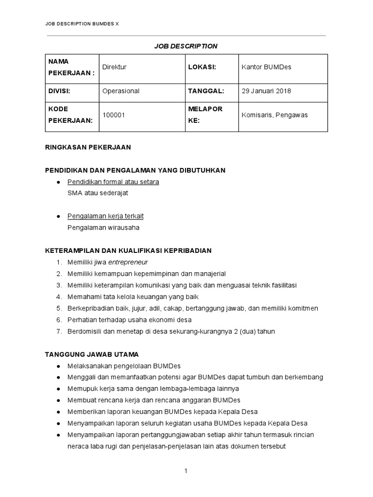 Job Desc Direktur Bumdes Contoh